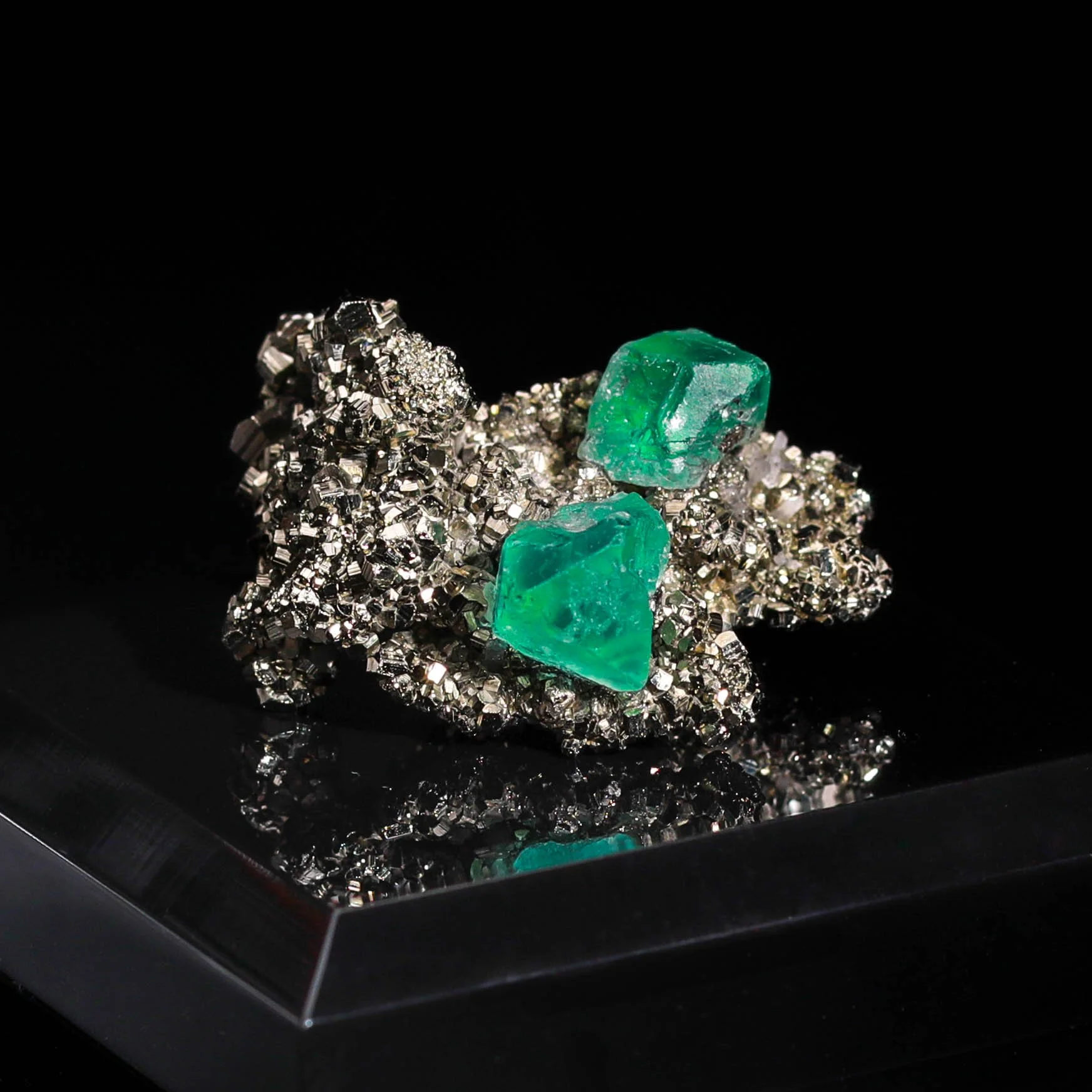A miniature marvel from Huanzalá, where green fluorite and golden pyrite unite in perfect harmony.